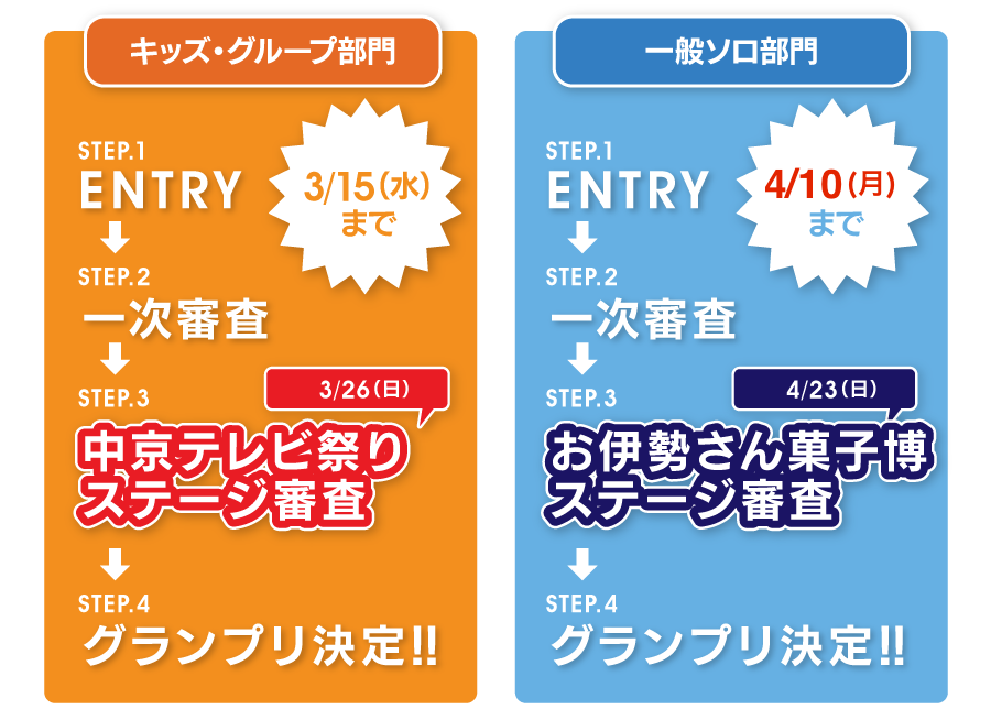 | 日 程 | キッズ・グループ部門 2017年3月26日(日)@中京テレビ番組祭り 一般ソロ部門 2017年4月23日(日)16:00~ @お伊勢さん菓子博2017 |